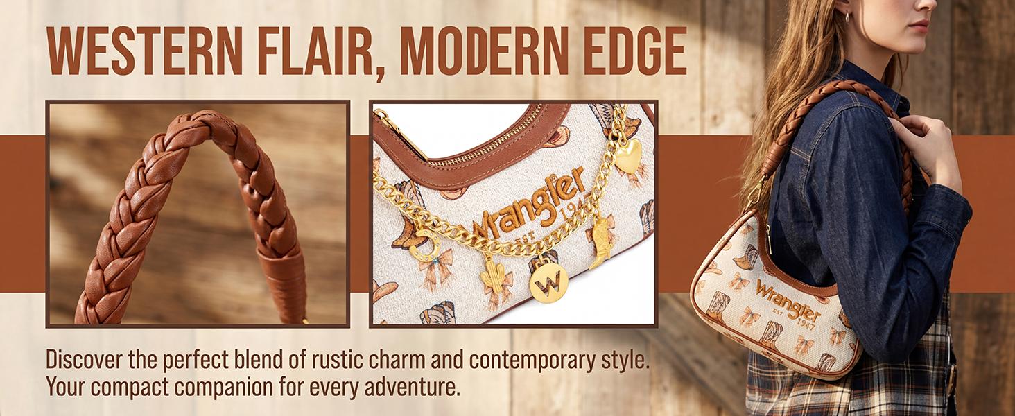 Discover the Wrangler Braided-Handle Shoulder Bag, a stylish, compact accessory with a bold Western flair. This western shoulder bag is crafted from durable canvas with rich brown tones, featuring a braided handle and elegant gold-tone chain details for added texture and shine.